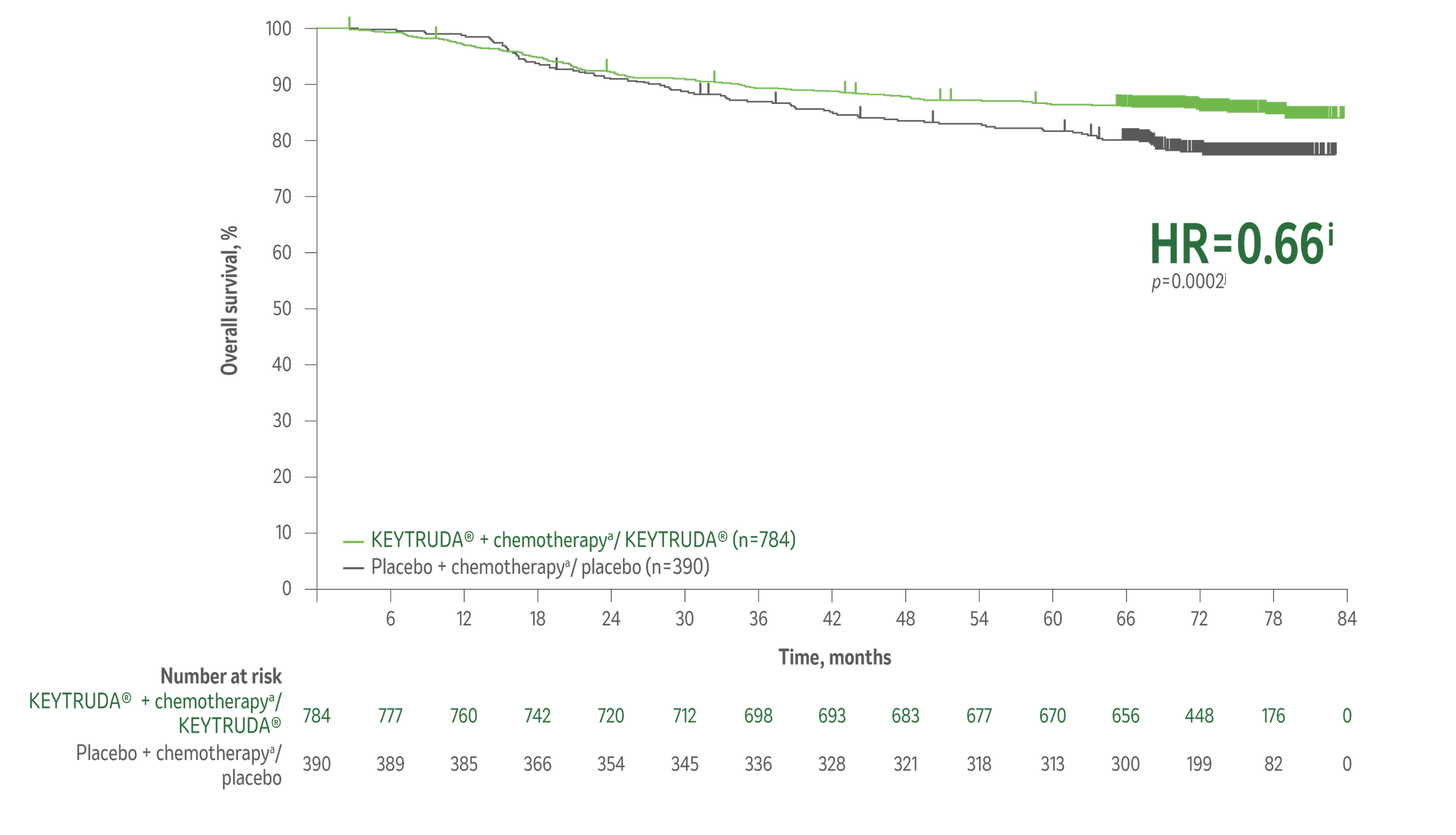 - 34% reduction (HR=0.66i; 95% CI, 0.50–0.87; p=0.002j) in the risk of death with KEYTRUDA® + chemotherapya/KEYTRUDA® vs placebo + chemotherapya/placebo.