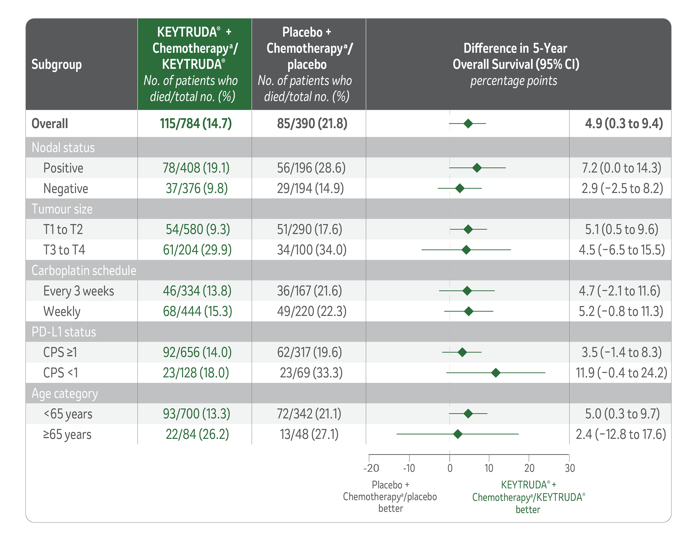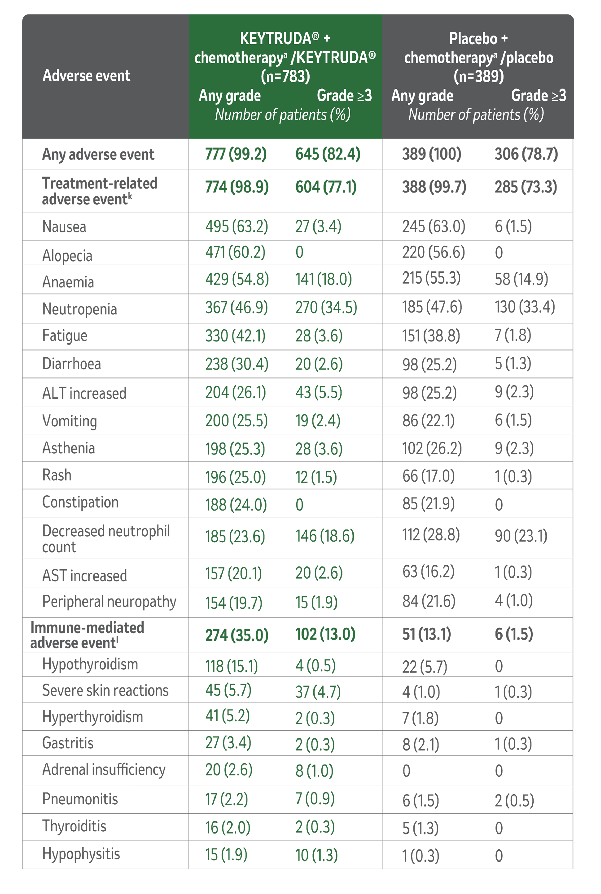 - The number of patients with an event (n/N) was 115/784 (14.7%) with KEYTRUDA® + chemotherapya/KEYTRUDA® vs 85/390 (21.8%) with placebo + chemotherapya/placebo.1