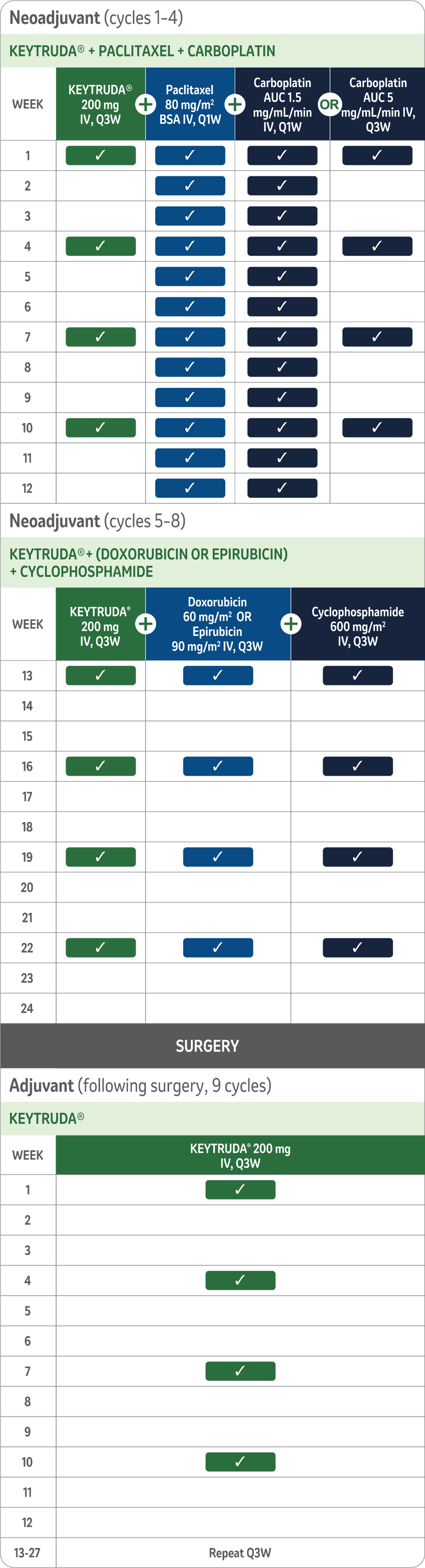When administering KEYTRUDA® as part of a combination with IV chemotherapy, KEYTRUDA® should be administered first as an IV infusion over 30 minutes. For the neoadjuvant and adjuvant treatment of high-risk early-stage TNBC, patients should be treated with neoadjuvant KEYTRUDA® in combination with chemotherapy for 8 doses of 200 mg Q3W or 4 doses of 400 mg Q6W or until disease progression that precludes definitive surgery or unacceptable toxicity, followed by adjuvant treatment with KEYTRUDA® as monotherapy for 9 doses of 200 mg Q3W or 5 doses of 400 mg Q6W or until disease recurrence or unacceptable toxicity. Patients who experience disease progression that precludes definitive surgery or unacceptable toxicity related to KEYTRUDA® as neoadjuvant treatment in combination with chemotherapya should not receive KEYTRUDA® monotherapy as adjuvant treatment.