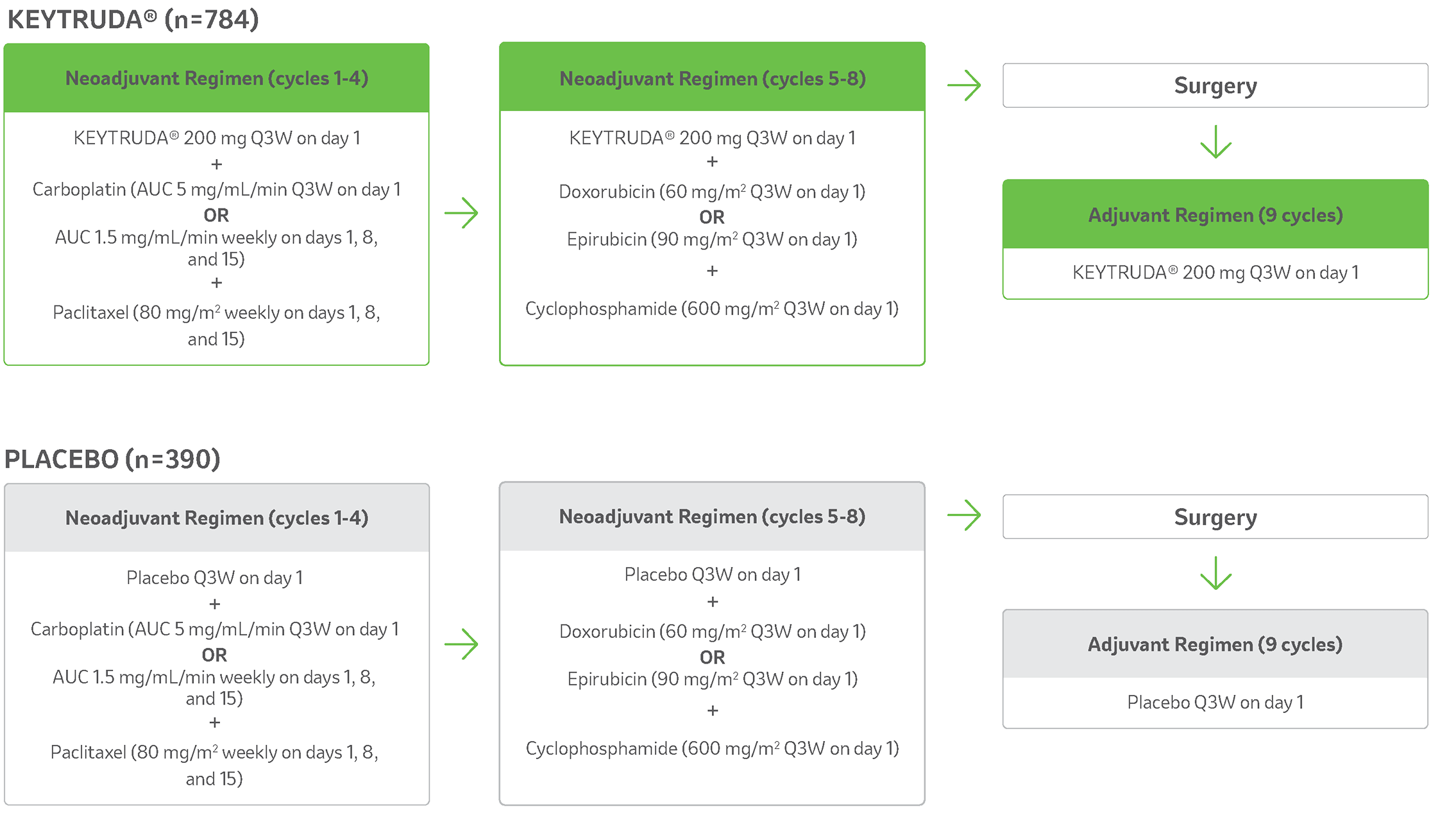 - Treatment with KEYTRUDA® or placebo continued until completion of treatment (17 cycles), disease progression that precludes definitive surgery, disease recurrence in the adjuvant phase, or unacceptable toxicity.